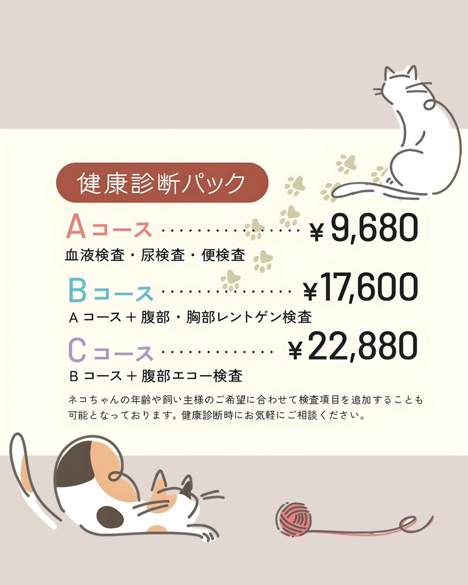 ネコちゃんの年齢や飼い主様のご希望に合わせて検査項目を追加することも可能です。お気軽に獣医師にご相談ください🐾